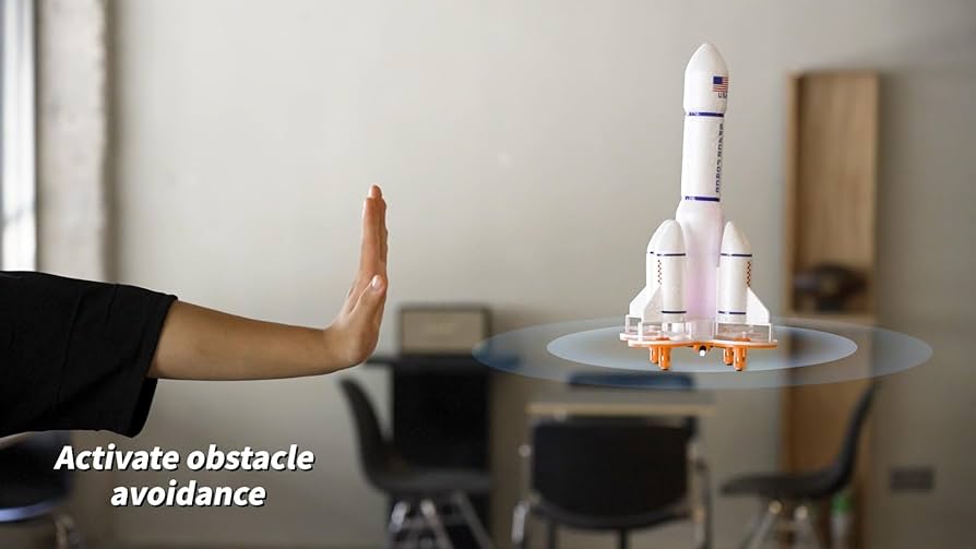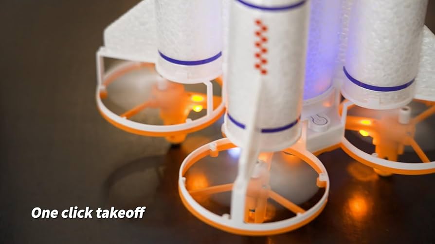 Includes rechargeable USB battery. RC Rocket Drone for indoor and outdoor use. Flying features include headless mode, hover mode, one key landing/return, 3 speed toggle Motion control and LED lights.